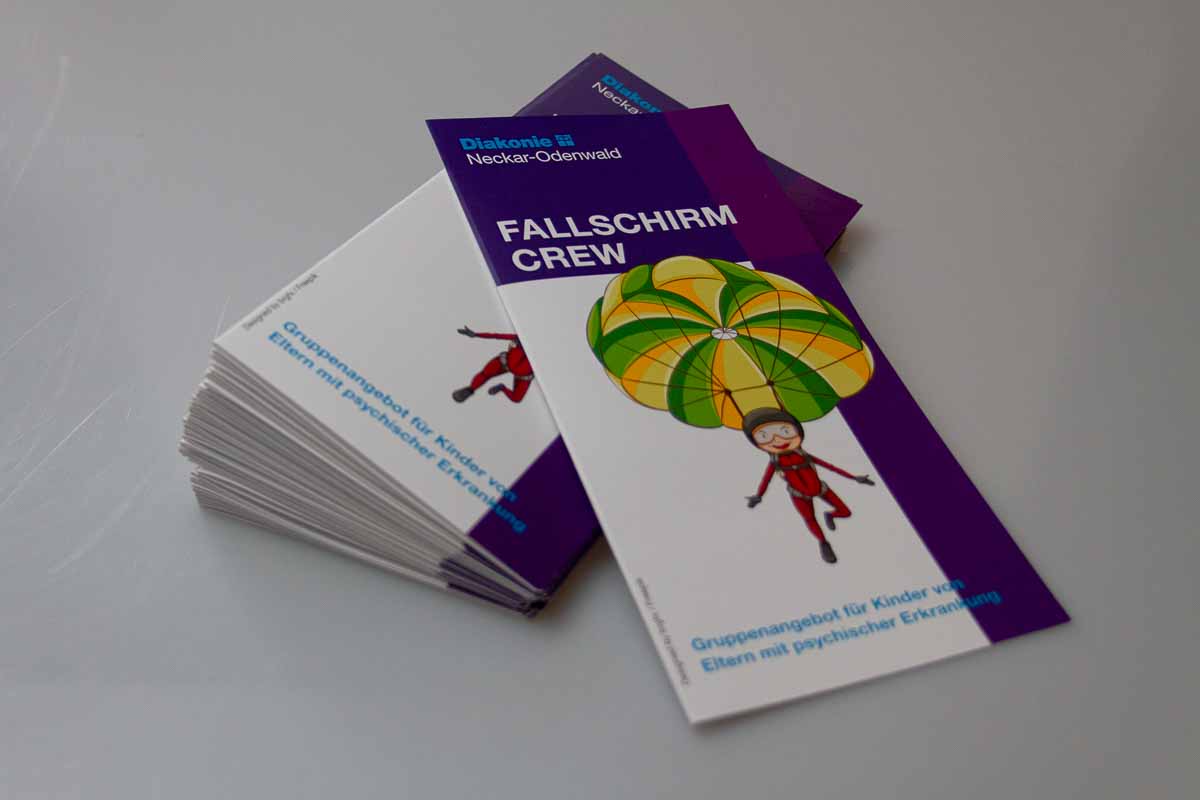 Die Diakonie im Neckar-Odenwald-Kreis hat mit der Fallschirmspringer-Crew ein neues Angebot ins Leben gerufen. Es richtet sich an Kinder, deren Eltern psychisch erkrankt sind – und soll ihnen Halt, Orientierung und einen geschützten Raum zum Austausch bieten. Für den Erstkontakt mit betroffenen Familien, Schulen und Fachstellen wurde ein Flyer benötigt, der das neue Angebot vertrauensvoll vermittelt. Der Flyer sollte kindgerecht, klar strukturiert und im Corporate Design der Diakonie gestaltet sein. Zusätzlich sollte das Material zur Weitergabe in der Fachwelt und im direkten Kontakt mit Familien eingesetzt werden können.