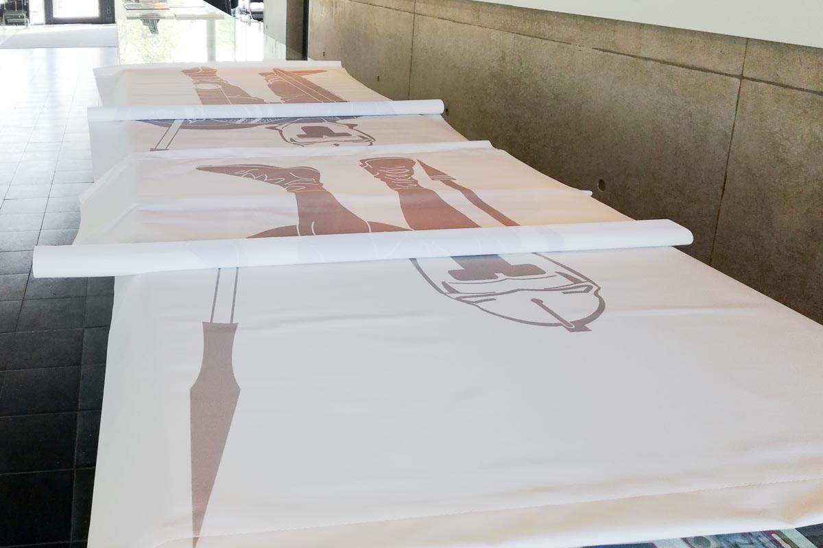 Angelehnt an die Fahnen im Ausstellungsraum wurden kleinere Fahnen für den museumspädagogischen Raum gestaltet und produziert.