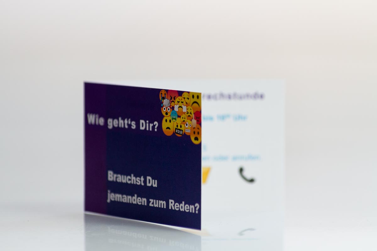 Visitenkarten können problemlos im Geldbeutel mitgeführt werden - so sind die Kontaktwege zur Psychologischen Beratungsstelle und die Öffnungszeiten der Jugendsprechstunde immer parat. Durch den Einsatz einer direkten, jugendlichen Sprache und die Verwendung von Emoticons, kann die Zielgruppe direkt angesprochen werden.