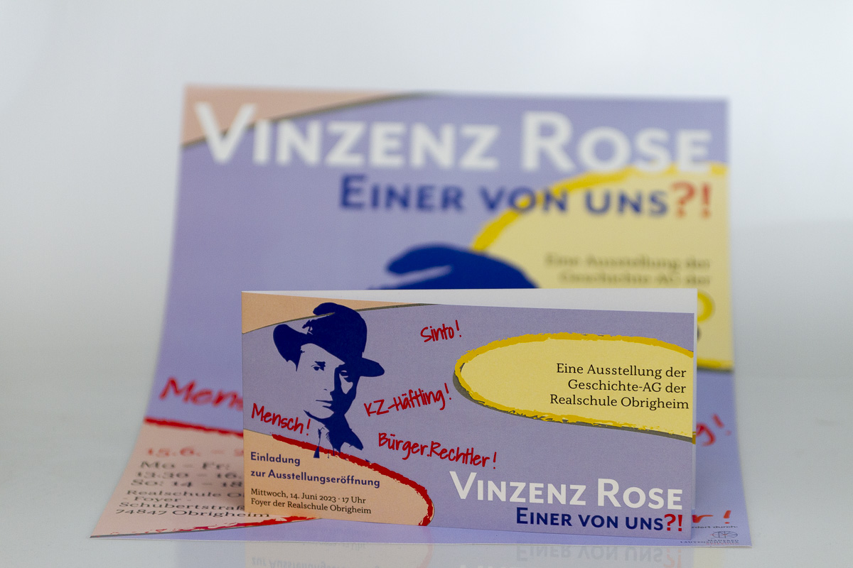 Schüler der Realschule Obrigheim entwickelten eine Ausstellung über den Sinto Vinzenz Rose. Mit professioneller Unterstützung wurden die Inhalte auf Ausstellungstafeln präsentiert. Um für genügend Resonanz bei der Bevölkerung zu sorgen, wurden passende Plakate und Einladungen für die offizielle Eröffnung benötigt.
