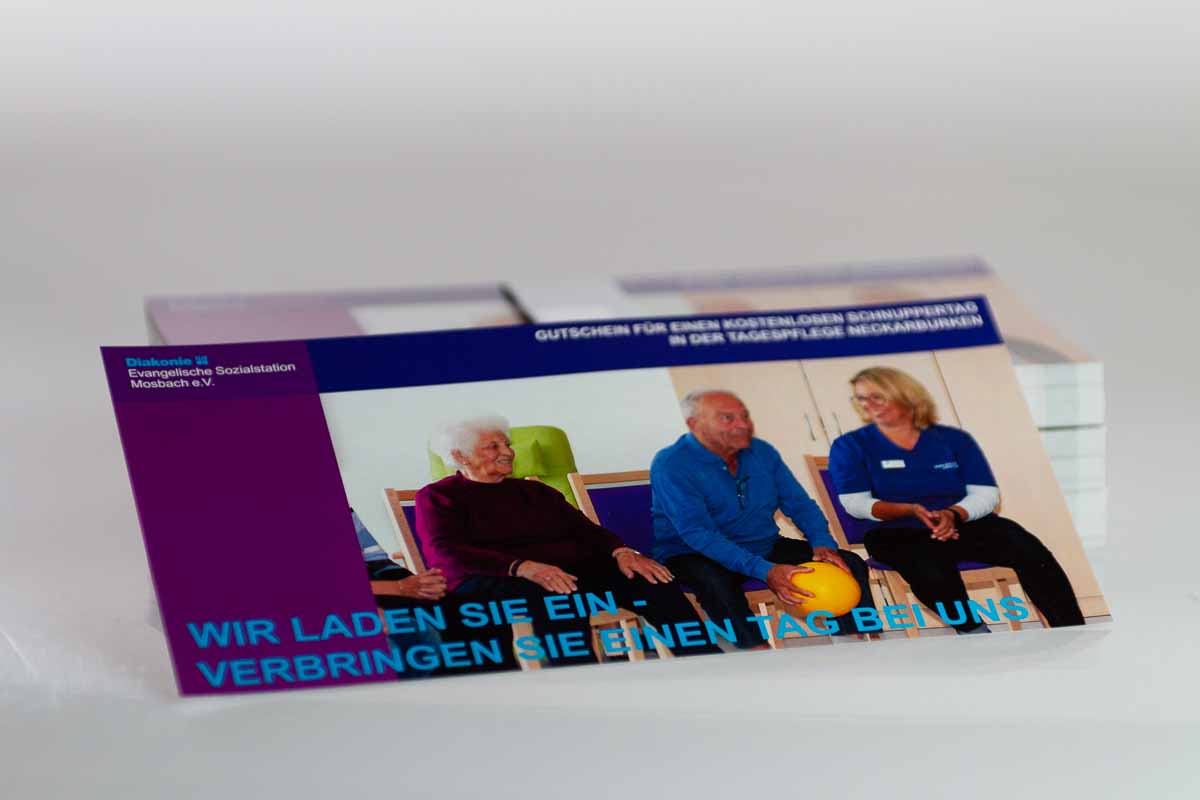 Gemeinsam mit dem Auftraggeber besprach Markus Slaby die genauen Anforderungen und Wünsche und diskutierte verschiedene Möglichkeiten. Die Entscheidung fiel auf eine XXL-Postkarte die im Corporate Design der Diakonie gestaltet wurde.
