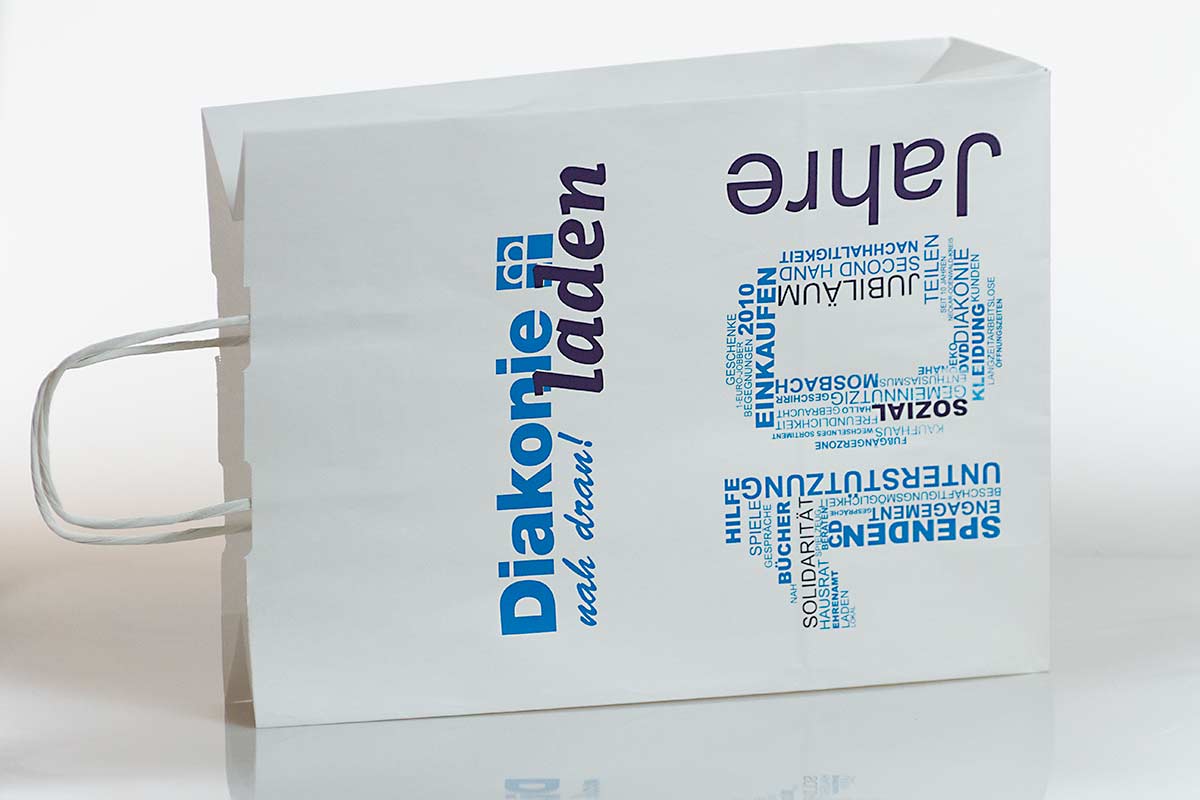 Eine stabile Papiertüte kann längerfristig genutzt werden und ist aus nachwachsenden Rohstoffen. Die Gestaltung bezieht sich nicht nur auf das 10-jährige Jubiläum sondern auch auf die Vielfältigen Angebote und Aufgaben des Diakonie-Ladens und lädt so ein, sich mit den Inhalten zu beschäftigen.
