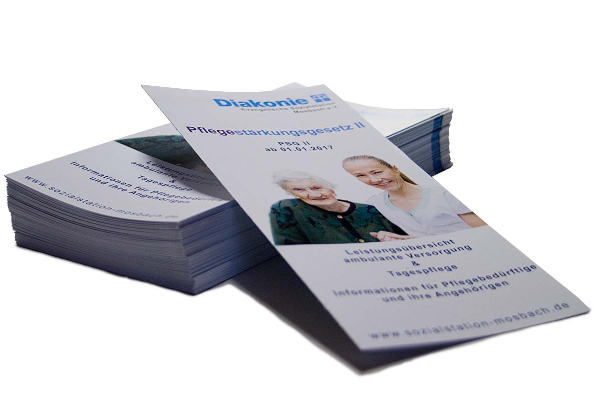 Mit einem Flyer informiert die Evangelische Sozialstation Mosbach e.V. ihre Kunden über Neuerungen im Pflegestärkungsgesetz II. Für die Ertellung des Flyers holte sich der ambulante Pflegedienst und Betreiber einer Tagespflege die Mosbacher Werbeagentur markus slaby media ins Boot.