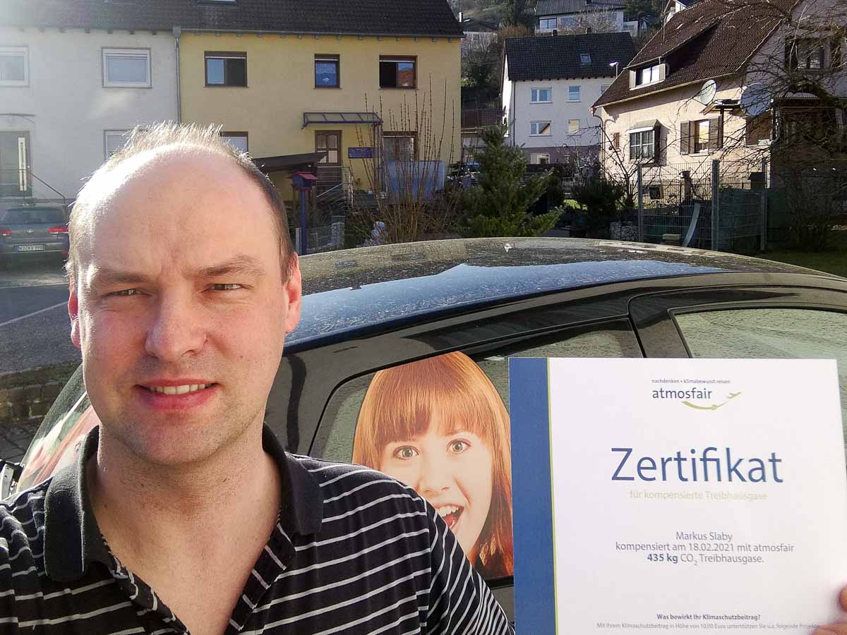 "Wenn es weiter weg geht oder neue Flyer, Broschüren oder Ähnliches ausgeliefert werden, geht es manchmal eben nur mit dem Auto", erklärt Slaby sein Verhalten weiter. Der im Jahr 2020 verbrauchte Kraftstoff setzte 432 kg CO2 frei. Mit einer Spende an atmosfair kompensierte Slaby das freigesetzte Treibhausgas, um den entstandenen Umweltschaden zumindest teilweise zu kompensieren.